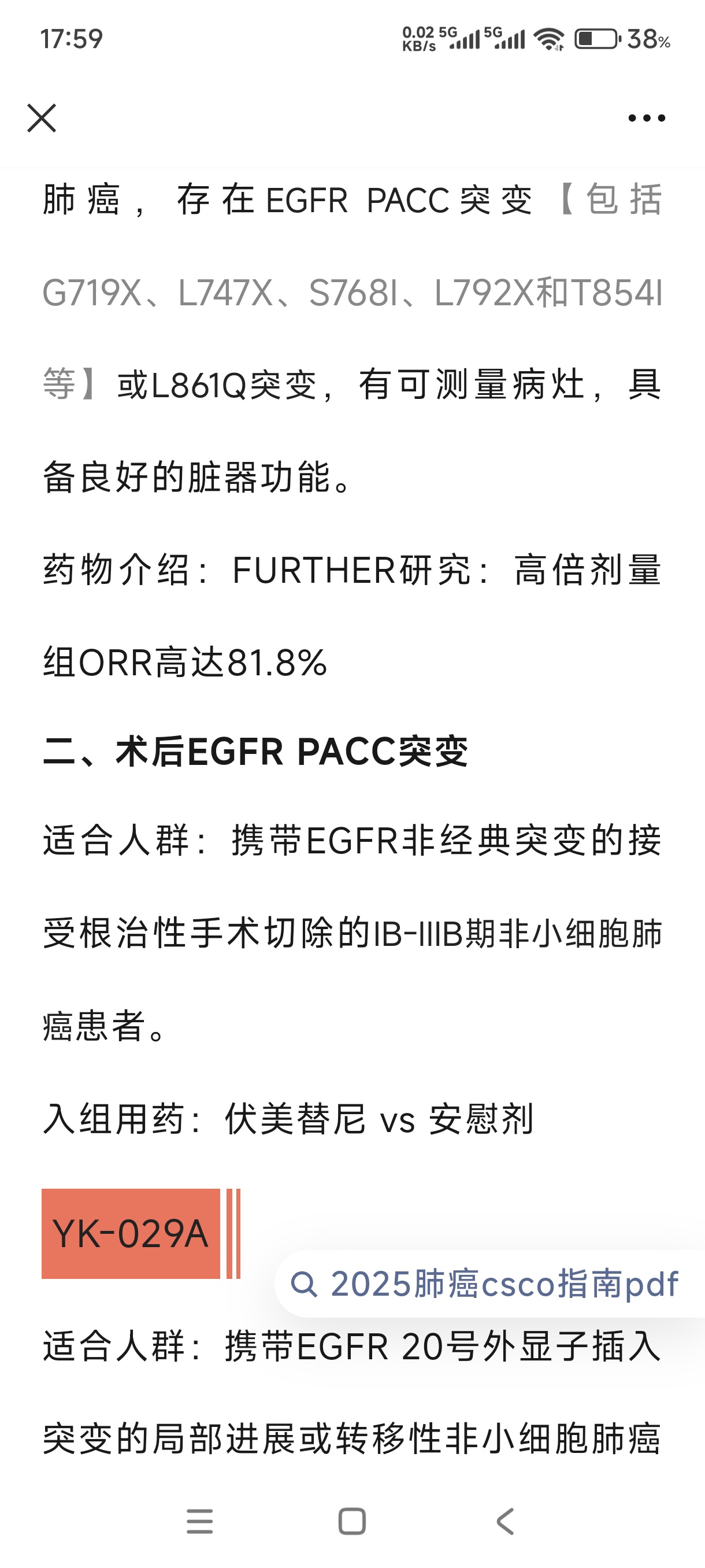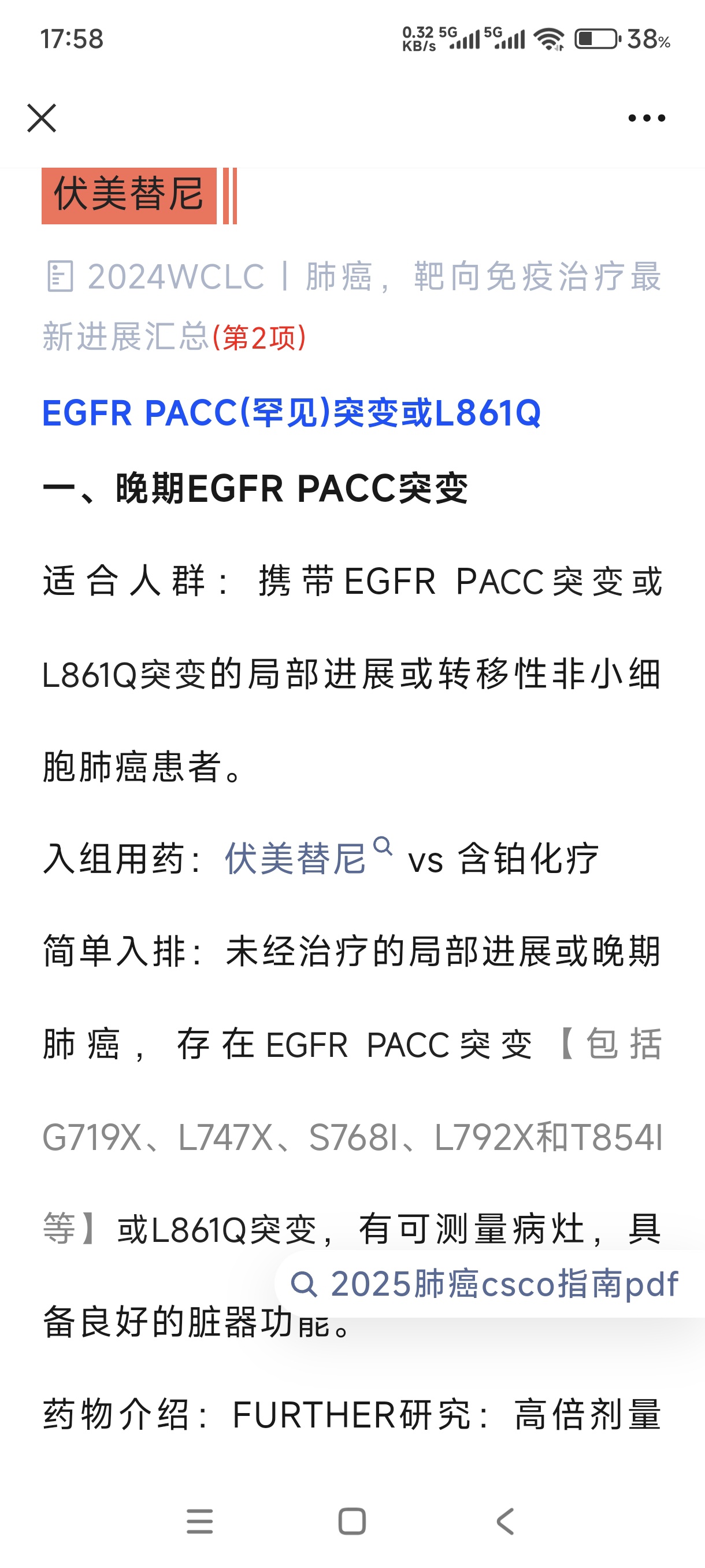 1,首先是病理报告信息不全,得先确定是不是完全性切除。。。。2 ,如果是完整切除的手术,术后非要吃靶向药,伏美替尼是一个可能带来最大生存获益的药物,其它任何药物都做不到。。。。。3,医药科技日新月异,带给患者根治的希望越来越大,也需要患者在了解最新概念的基础上,做出相对合适的选择。。。。。4,附图说明一下伏美替尼吧,相关知识面比较多 ,也还处于深入探索之中,有兴趣的可以自己搜索,厂家在花费巨资投进pacc突变.应该也是有他们自己一套科学理论与实践数据 绝对不是人傻钱多。。。。其中甚至在布局术后的pacc患者,正好合适你们,如果经济条件限制,可以考虑。